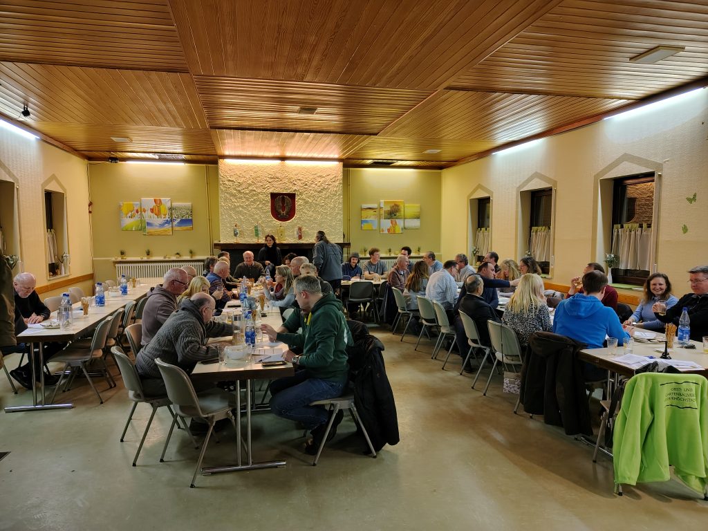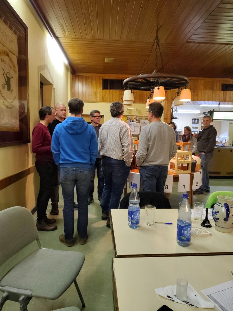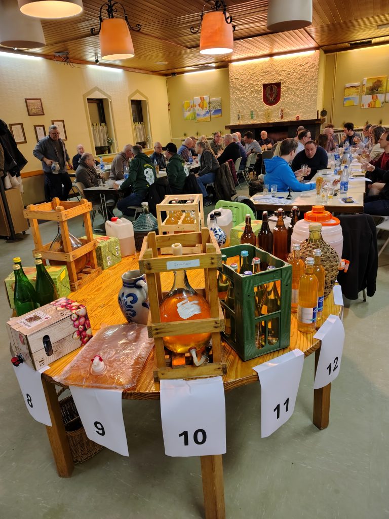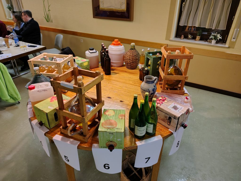 Seit 2007 treffen sich also Apfelwein-Aficionados auf Einladung des OGV, um den neuen Jahrgang zu begutachten. War es zu Beginn eine Veranstaltung mit Fokus auf die lokalen Hobbyisten, zieht der Anstich seit einigen Jahren auch Enthusiasten aus der Ferne an: Von Frankfurt bis Medenbach reichte diesmal die Herkunft der insgesamt 18 Apfelweinproben. Während man sich anderswo nur zu Wettbewerben trifft, wo das Kompetitive im Vordergrund steht, kann man sich beim OGV Apfelwein-Anstich einfach mal auf das Stöffsche selbst und den Menschen dahinter konzentrieren. Es geht um das Kennenlernen, um den Austausch von Kontakten, ums Netzwerken und natürlich um Erfahrungsaustausch. Wie macht man guten Apfelwein? Indem man mit Leuten spricht, die darin Erfahrung haben!