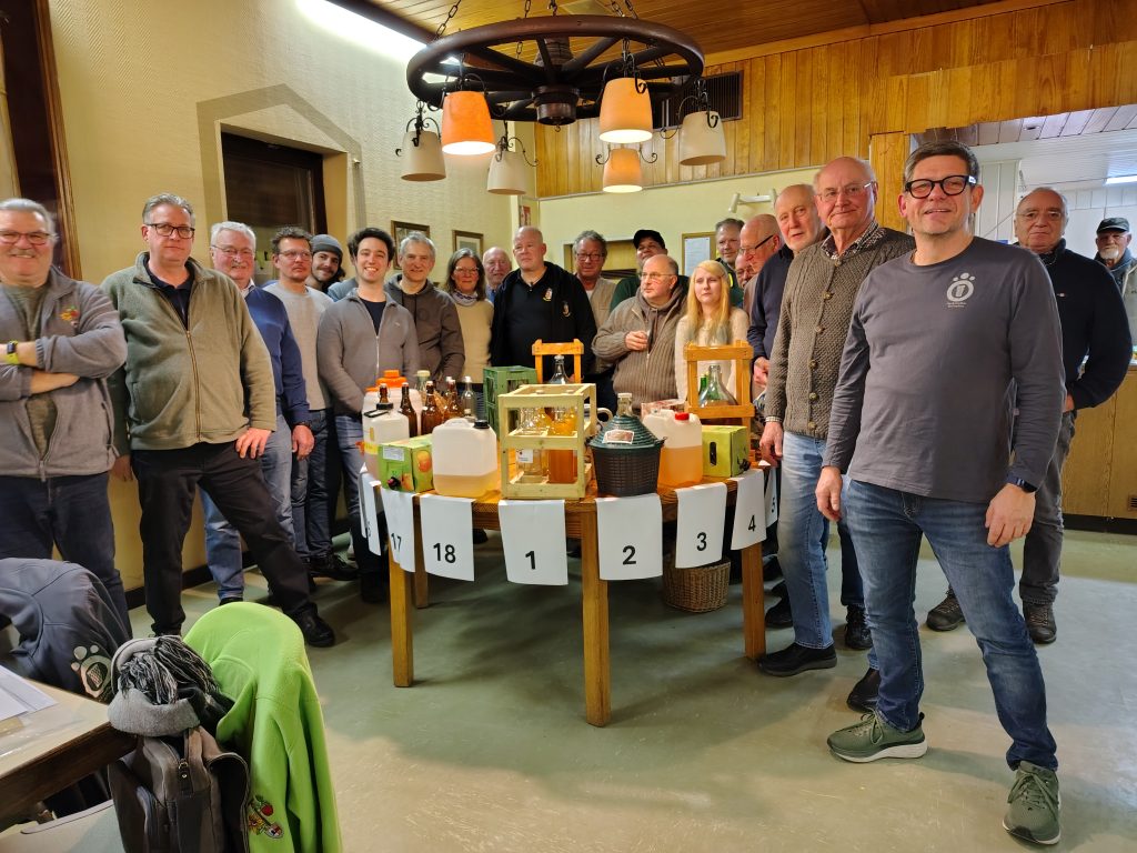 Der Jahrgang 2025 war für viele eine Herausforderung. Vielerorts gab es einen dramatischen Mangel an Äpfeln. Da wurde dann gekeltert was man bekam – eine Sortenauswahl war reiner Luxus. „Vielerorts“ war dem so, aber nicht in Eschborn/ Niederhöchstadt. Hier gab es viele Äpfel unterschiedlichster Sorten, und Dank der vielen Streuobstwiesen auch reichlich Kelteräpfel. Einen Mangel an solchen schmeckt man sofort: keine Säure, flacher Geschmack, wenig Aroma. Wohl dem der Rheinischen Bohnapfel, Boskoop, Trierer Weinapfel, Brettacher, Schafsnase, Gewürzluiken und ähnliche „alte Sorten“ sein Eigen nennen darf. Sie geben dem Stöffsche Tiefe und diese dem Apfelwein so typische Kombination aus Säure und Süße. Richtig ausbalanciert hat man die Streuobstwiese im Glas, der Schoppe duftet frisch, der erste Schluck ist wie ein Biss in einen süßsauren Apfel, nur dass sich der Geschmack viel länger hält und langsam die Kehle runterläuft. Als Sauergespritzter kommt noch ein leichtes Prickeln dazu … na, schon Durst?