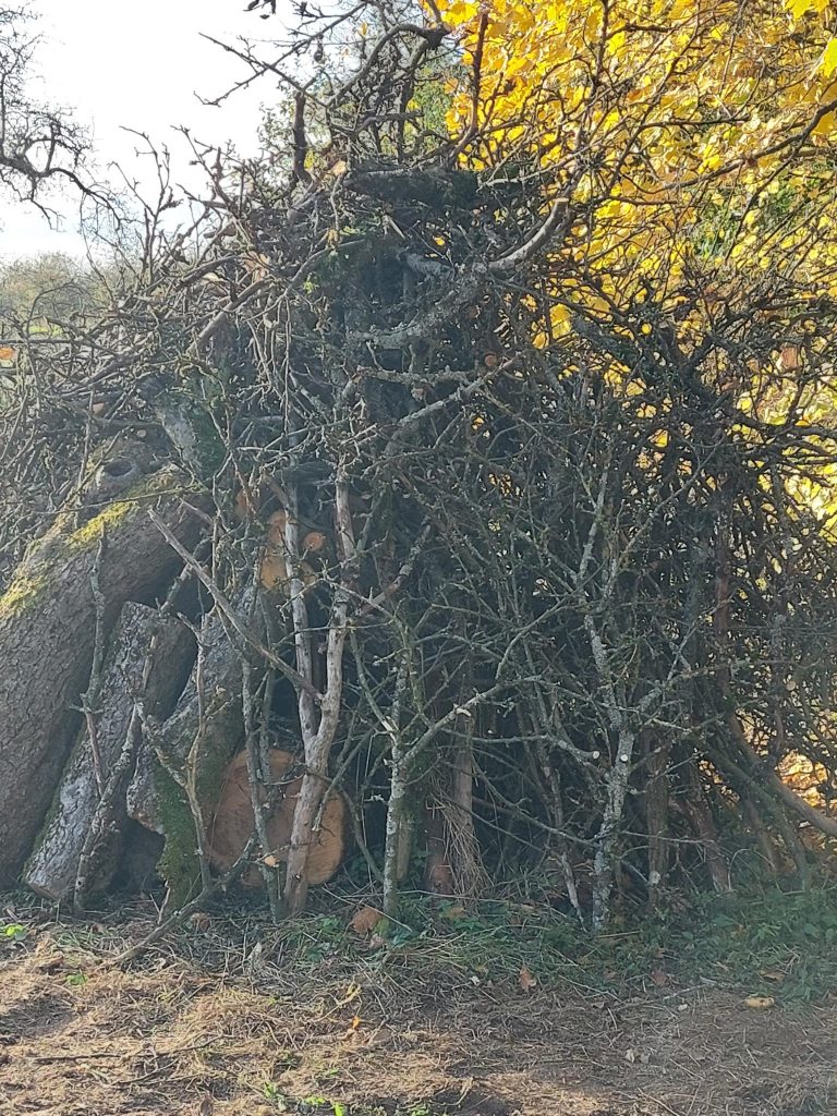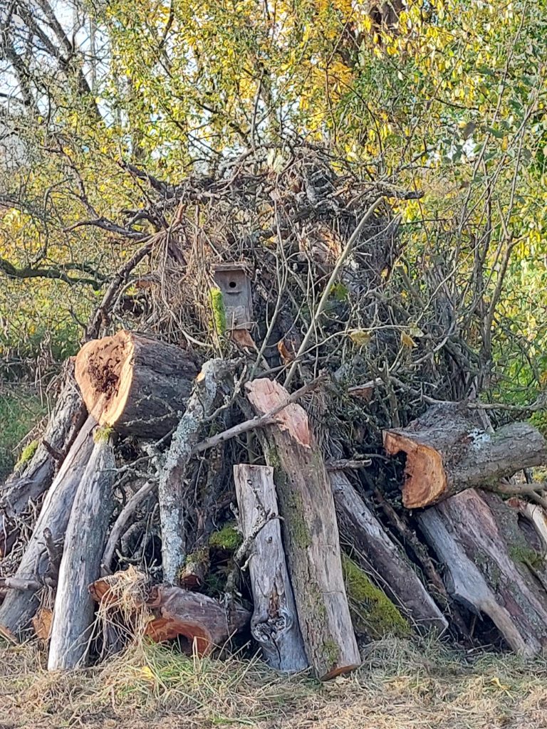 Nun haben Rainer, Harald und Udo mal aufgeräumt. Circa 150qm freie Fläche sind wieder zu sehen. Mittendrin ein Totholzhaufen, der sicher bald voller Leben sein wird. Die jetzt noch braune Fläche wird ganz von selbst wieder grün.
