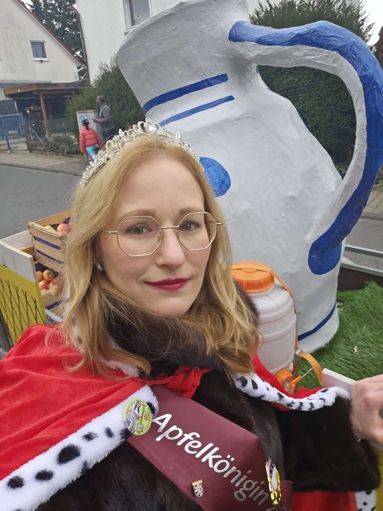 Der Wagen zeigte den vom Adventskreisel bekannten Bembel; die Fußgruppe verteilte Äpfel – was nicht nur bei den Kindern gut ankam. Da durfte natürlich auch Apfelkönigin Astrid I. nicht fehlen!