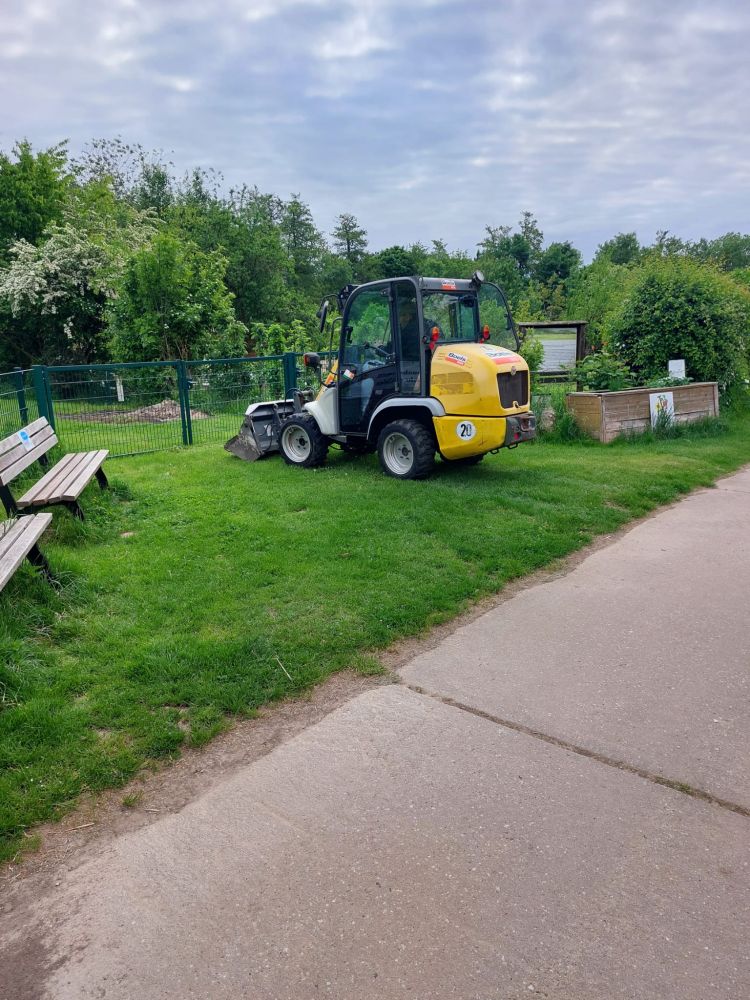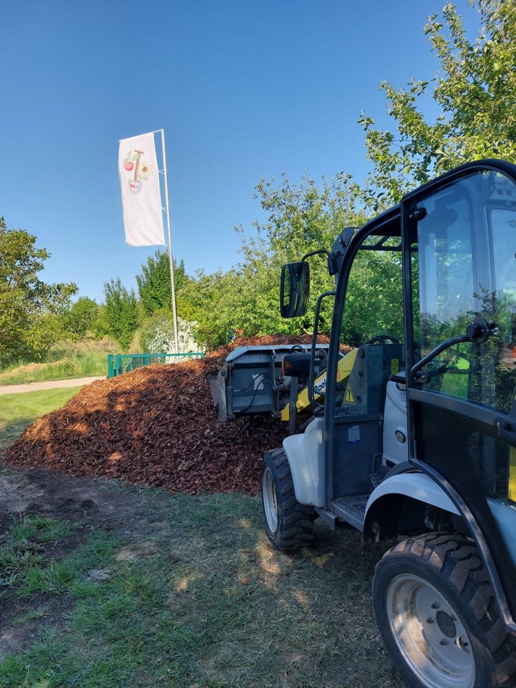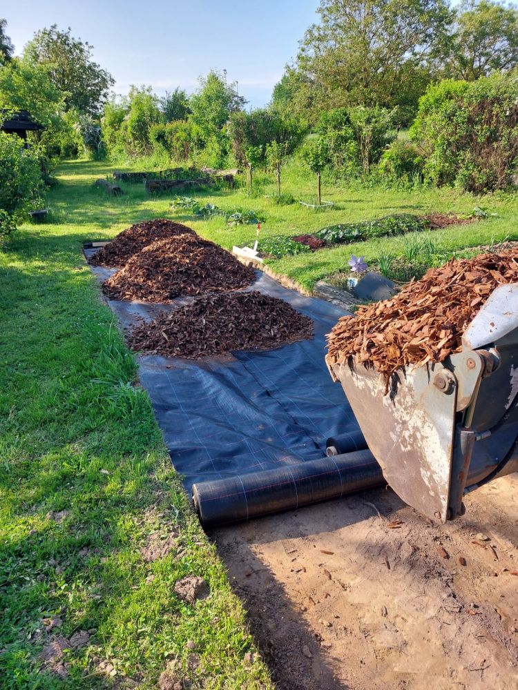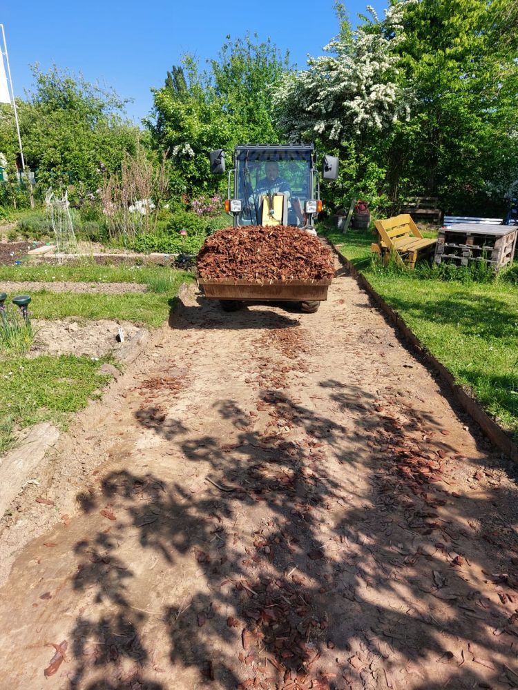 Mit schwerem Gerät wurde der alte Weg abgeräumt und etwas verbreitert. Dann wurde ein Flies ausgebracht und neuer Rindenmulch aufgetragen.