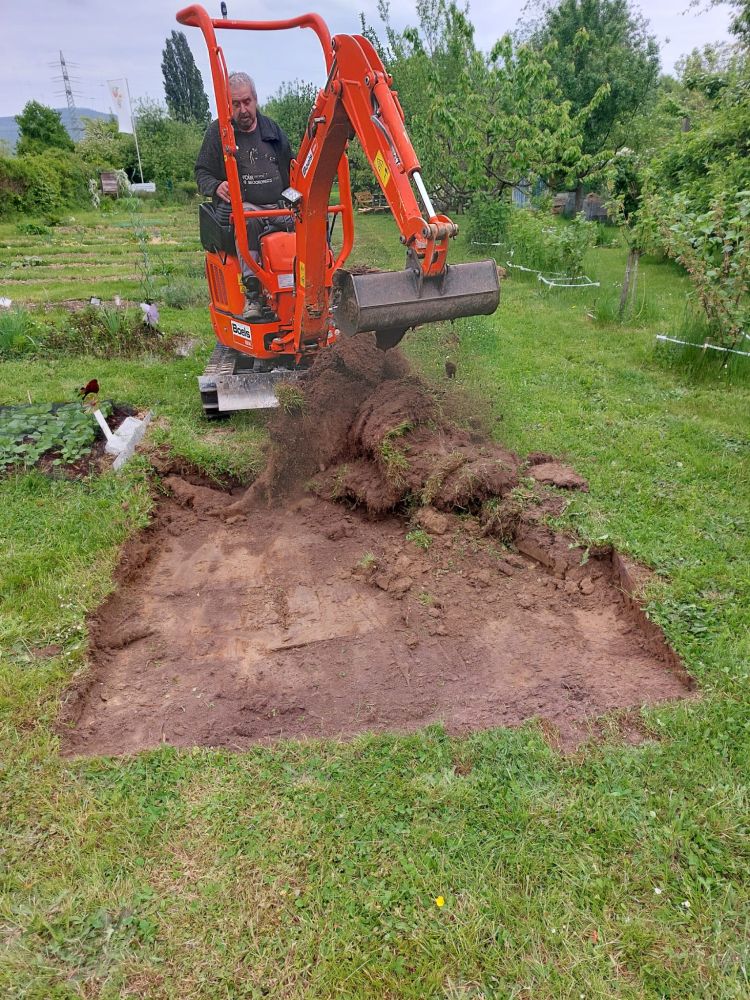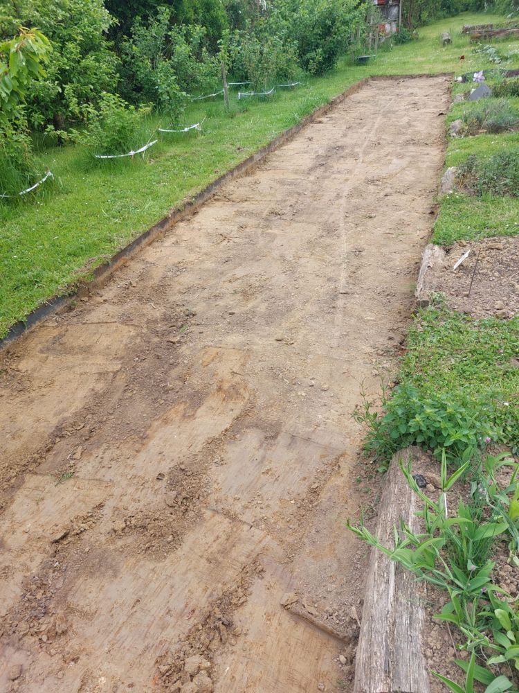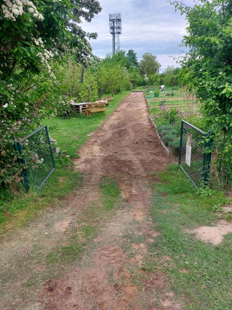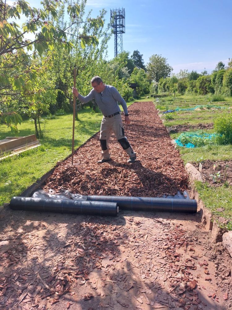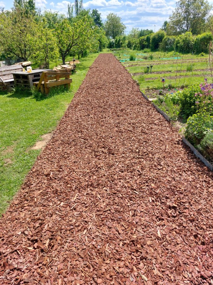 Der Weg im Lehrgarten war in die Jahre gekommen. Trotz regelmäßiger Auffrischung des Rindenmulchs sah es einfach nicht mehr schön aus – und dem überall durchblitzenden „Unkruat“ war auch nicht mehr bei zu kommen. Also: einmal neu bitte!